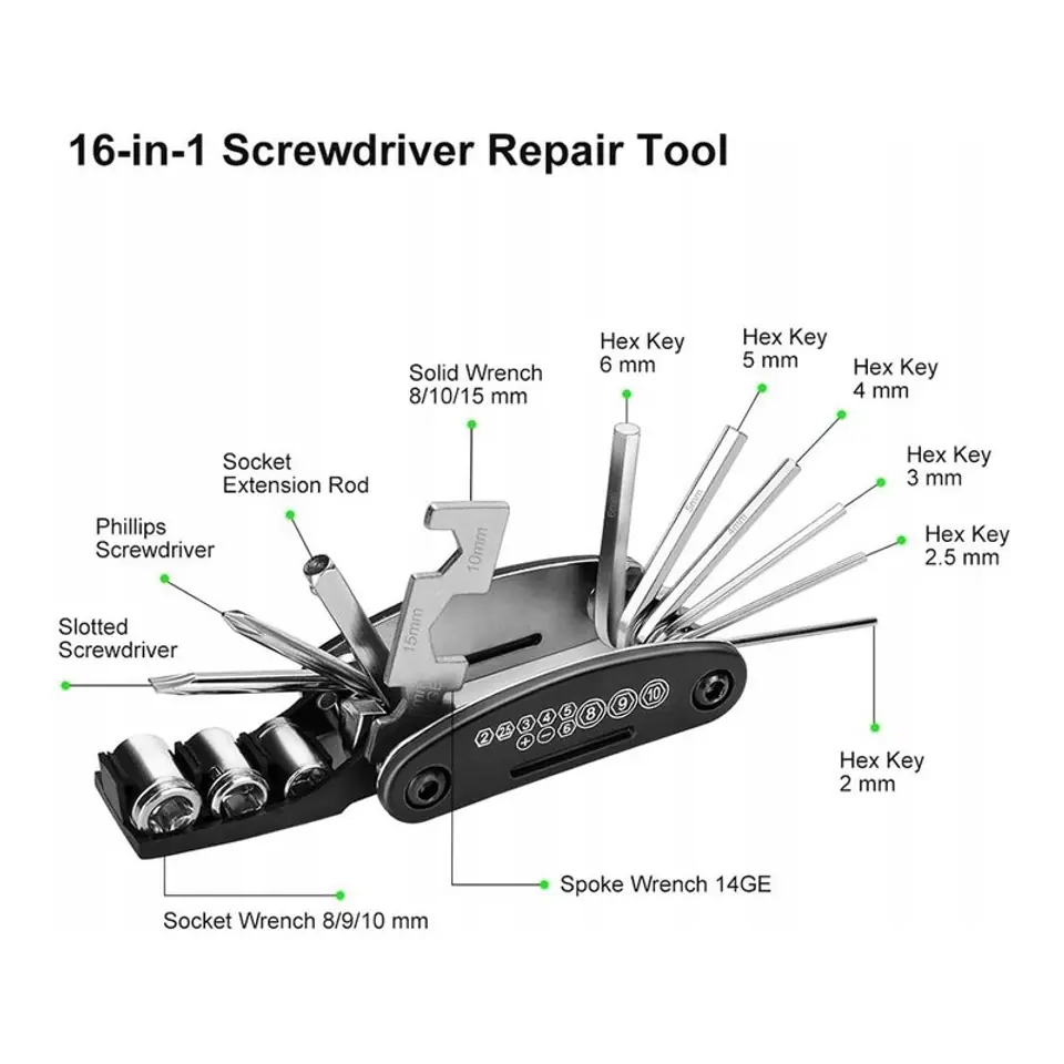 Zestaw kluczy rowerowych 16W1 Zestaw zawiera: 6 kluczy imbusowych: 2mm, 2,5mm, 3mm, 4mm, 5mm, 6 mm2 Wkrętaki: Płaski oraz Krzyżakowy3 Nasadki: 8mm, 9mm i 10mmWielowymiarowy klucz płaski: 8 mm, 10 mm, 15 mmKlucz do szprychAdapter do nasadek Specyfikacja: MATERIAŁ: MetalKOLOR: Czarny, SrebrnyWYMIARY: 9 cm x 2,5 cmWAGA: ok. 200 gILOŚĆ KLUCZY: 16