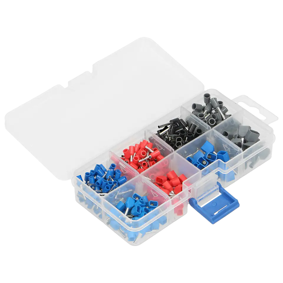 Zestaw tulejek izolowanych do zaciskania na końcach przewodów. Tulejki pozwalają na wykonanie estetycznego i pewnego zakończenia przewodu. Dzięki zastosowaniu tulejki możemy stosować przewód typu linka w szybkozłączkach wciskanych oraz poprawić jakość połączenia śrubowego. Zawiera 350 elementów - tulejki pojedyncze: 0,75mm x 2,10mm - 80 szt.; 1mm? x 10mm: 70 szt.; 1,5mm? x 10mm: 60 szt.; 2,5mm? x 10mm: 50 szt. oraz tulejki podwójne: 0,75mm? x 8mm: 30 szt.; 1mm? x 10mm: 25 szt.; 1,5mm? x 10mm: 20 szt.; 2,5mm? x 10mm: 15 szt.