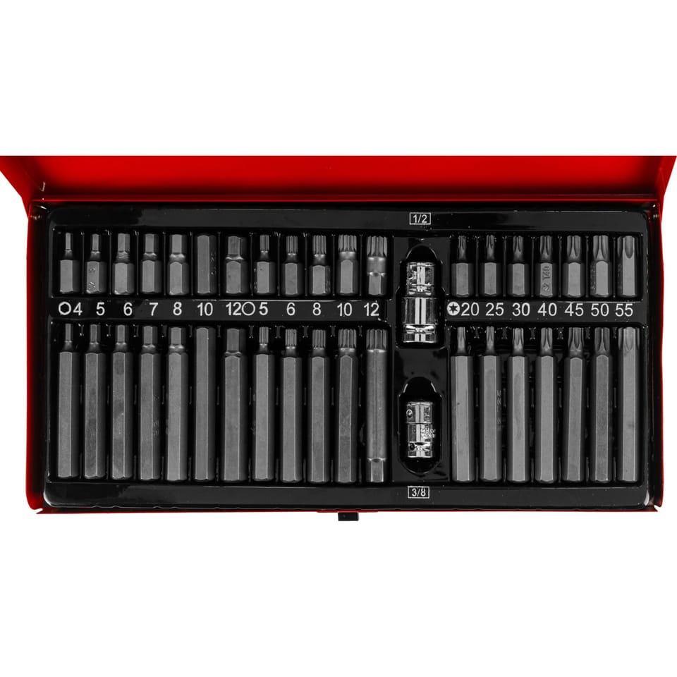 - 10 mm TORX T20, T25, T30, T40, T45, T50, T55 po 1 szt. 30 i 75 mm XZN M5, M6, M8, M10, M12 po 1 szt. 30 i 75 mm HEX 4, 5, 6, 7, 8, 10, 12 mm po 1szt. 30 i 75 mm