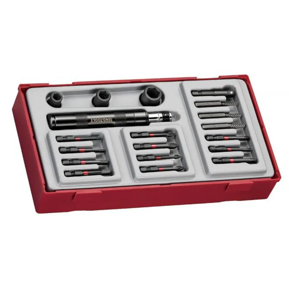 Zestaw wkrętaka udarowego składający się z 19 elementów. Praktyczny zestaw do wykręcania opornych wkrętów i śrub, zawierający serię grotów skrętnych 50 mm z chwytem 1/4”, trzy małe nasadki udarowe oraz specjalne wykrętaki śrub. Mocna rękojeść udarowa z chwytem 1/4”. W pudełku z formowanego wtryskowo tworzywa sztucznego. Może być używany osobno lub w połączeniu z innymi elementami systemu TengTool.