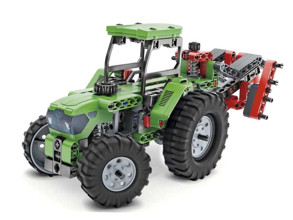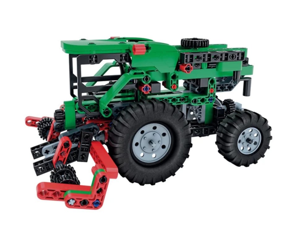 Zestaw zawiera ponad 200 elementów, w tym kompletny mechanizm różnicowy, opony i felgi, koła zębate, przeguby kardana, dźwignie, drążki i panele.