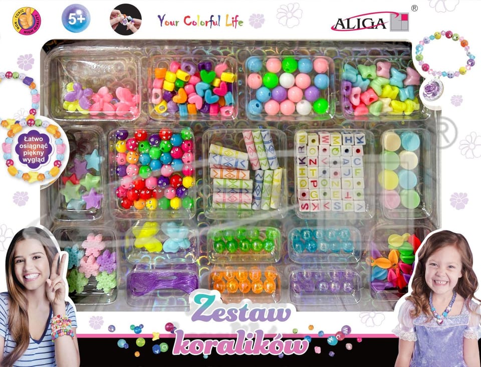 Zestaw koralików plastikowych mix kolorów i kształtów op. ok. 230szt.+2x 120cm żyłka PJ-2036 ALIGA