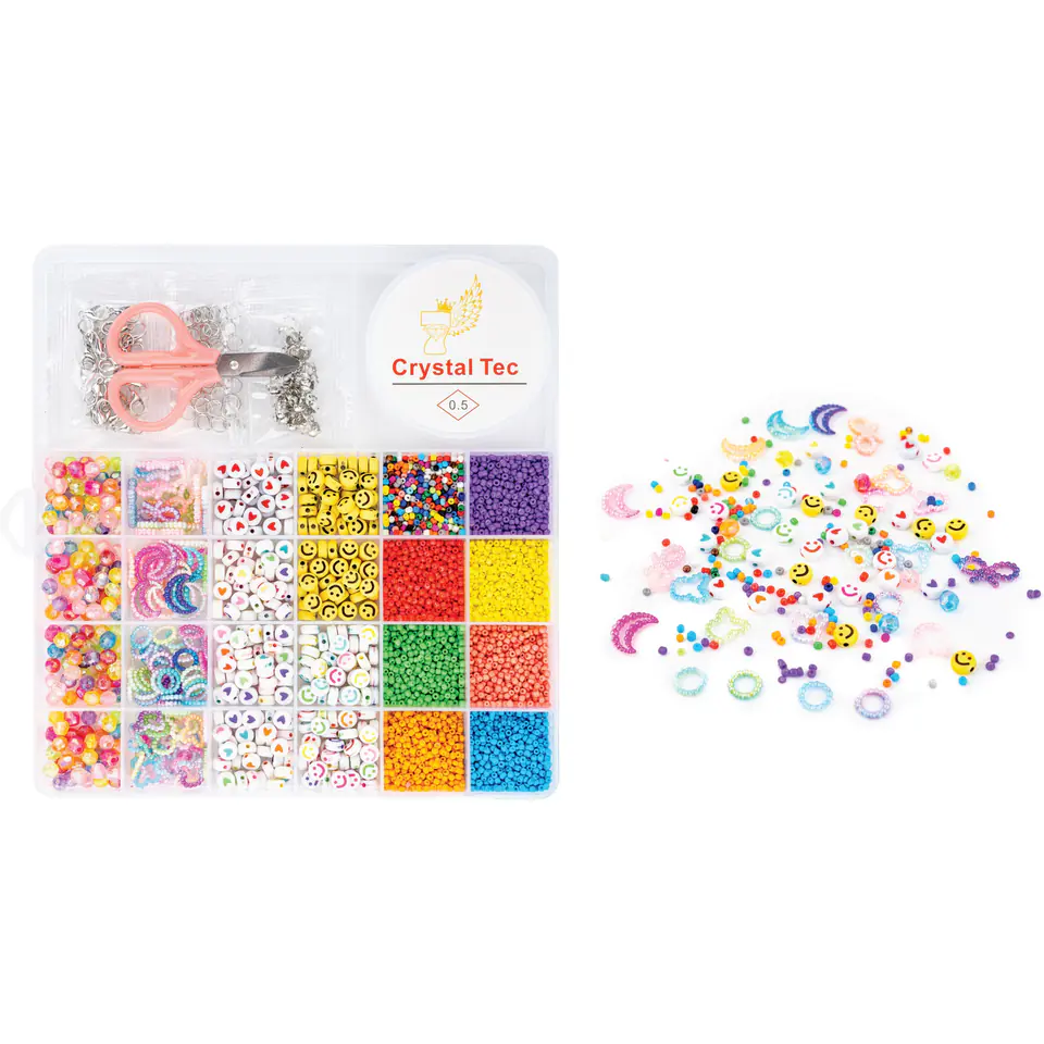 Zestaw biżuteryjny w zamykanym pudełku, zawierający: Koraliki 2mm, otwór 0,8mm, mix 8 kolorów x 10g Koraliki z buźkami 7mm, otwór 1mm, mix 4 kolorów x 5g Koraliki z serduszkami 7mm, otwór 1mm, mix 4 kolorów x 5g Koraliki kształty, mix 4 wzorów i kolorów x 2,5g Koraliki 6mm, otwór 2mm, mix kolorów: 4 przegródki x 5g 20 zapięć 50 ringów 40 zacisków Żyłkę elastyczną, silikonową 0,5mm o dł. 10m Nożyczki Wymiary pudełka: 20cm x 19cm x 1,8cm