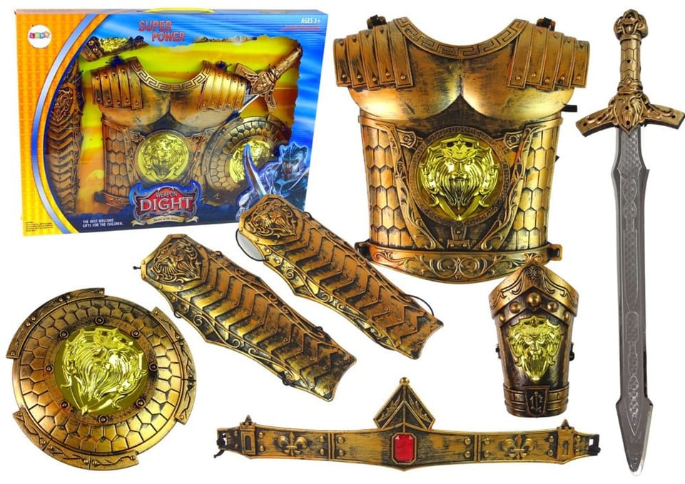 Większość osób marzy o rycerskich przygodach, które nieraz słyszeli w bajkach. Przemierzać góry i doliny, aby ratować ludność przed potworami i piękne księżniczki z opresji. Piękna, złota zbroja z dodatkami przeniesie malucha w bajkowy świat. Ochraniacze na nogi, tarcza, zbroja wykonane są z twardego plastiku, będą stanowić potężną skorupę w trakcie walk.