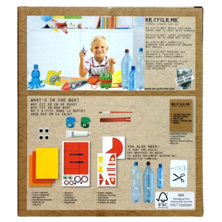 Zestaw Kreatywny - Samolot - Re-Cycle-Me Zestaw Re-Cycle-Me to niezwykłe pudełko, które przyniesie dzieciom wiele zabawy, radość z tworzenia oraz pobudzi wyobraźnię, a jednocześnie pokaże jak łatwo możemy dbać o naszą planetę. Wewnątrz znajdują się materiały oraz instrukcja, które pozwolą stworzyć 5 zabawek: - Samolot - Rakietę - Ośmiornicę - Żabę - Świnkę To co potrzebujesz do stworzenia wszystkich zabawek: - 3 duże butelki plastikowe - 3 małe butelki plastikowe - Klej - Nożyczki Wszystkie elementy znajdujące się wewnątrz opakowania, pokazane są z tyłu pudełka. Opakowanie wykonane jest z kartonu certyfikowanego FSC. Re-Cycle-Me wierzy w świat, w którym dzieci i ich rodzice stają się bardziej świadomi ilości śmieci, które produkujemy. Świat, w którym dzieci wykorzystując je ponownie zmniejszają ich ilość. Ten produkt jest przeznaczony dla dzieci tylko pod nadzorem rodziców. Ten produkt jest przeznaczony dla dzieci w wieku 4+. RE16BS359