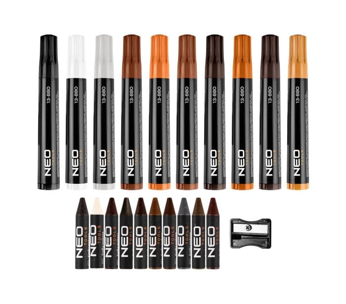Uniwersalny zestaw do szybkiej i samodzielnej naprawy mebli, paneli czy innych powierzchni drewnianych. W zestawie 10 różnokolorowych wypełniaczy woskowych, temperówka i 10 różnych markerów. Zestaw umożliwia łatwą naprawę drobnych ubytków oraz zarysowań. W zależności wielkości uszkodzenia wykorzystujemy wypełniacze woskowe do załatania ubytku oraz markerów w przypadku tych najdrobniejszych rys i powierzchni często eksploatowanych. Kolory: czarny, biały, szary, mahoń, klon, wiśnia, orzech, spalona sjena, kasztan, dąb
