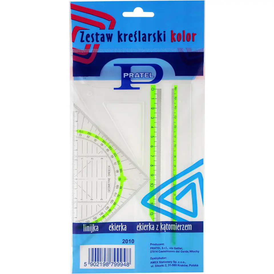 Zestaw kreślarski PRATEL zawiera: linijkę 30 cm, ekierkę ze skalą 16 cm i 22 cm, kątomierz 180 stopni. Praktyczne artykuły biurowe i kreślarskie wykonane z najwyższej jakości polistyrenu z nieścieralnymi podziałkami i precyzyjnym nadrukiem skali (do 1/1000 cm). Zestawy przeznaczone zarówno do użytku szkolnego, biurowego, jak i w profesjonalnych biurach technicznych.
