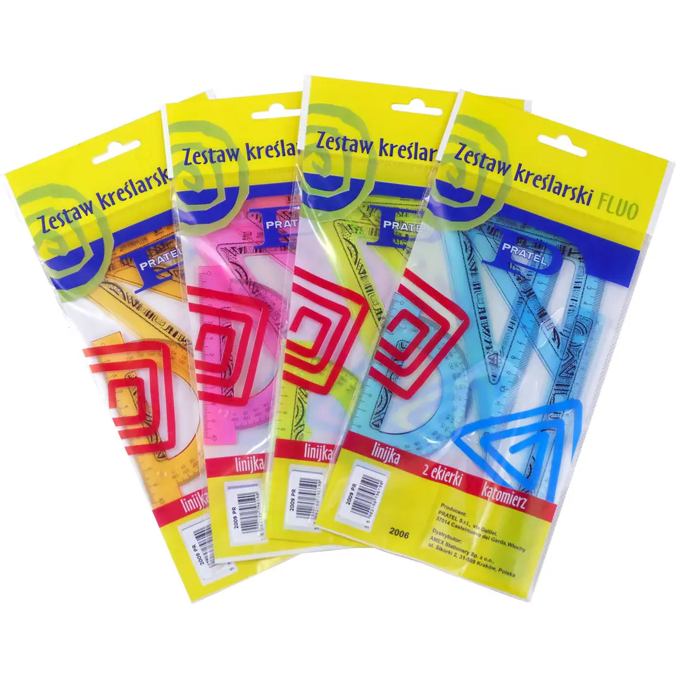 Praktyczne artykuły biurowe i kreślarskie wykonane z najwyższej jakości polistyrenu z nieścieralnymi podziałkami i precyzyjnym nadrukiem skali (do 1/1000 cm) w neonowych, transparentnych kolorach z czarnym nadrukiem. Produkty mają zaokrąglone rogi dla bezpieczeństwa użytkownika. Wykonane z polistyrenu o odpowiednim stosunku twardości do elastyczności zapewniającym wysoką odporność na złamania. Zestawy przeznaczone zarówno do użytku szkolnego, biurowego, jak i w profesjonalnych biurach technicznych. Zestaw kreślarski zawiera: linijkę 16cm, ekierkę ze skalą 10 cm i 14 cm, kątomierz 180 stopni.
