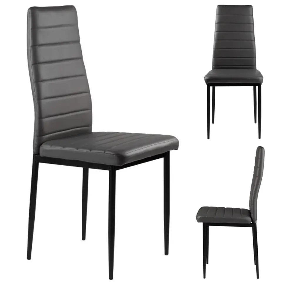 Krzesła będą świetnie współgrać z rodzinnym stołem w Twojej jadalni i kuchni. Szare poszycie wykonane z miękkiej ekoskóry i czarne, proste nogi tworzą ciekawe połączenie, które sprawia, że krzesła będą świetnie wyglądać i wpasują się w każdy rodzaj wnętrza, dodając mu wyjątkowego charakteru.