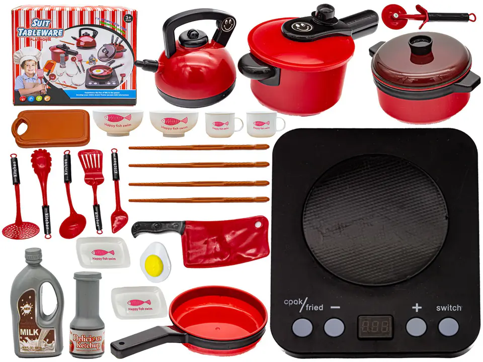Zestaw zawiera wiele produktów, takich jak płyta grzewcza, naczynia, garnki, czajnik i wiele innych akcesoriów. Zabawka charakteryzuje się wysoką jakością i dbałością o detale. Doskonale odwzorowuje gotowanie w prawdziwej kuchni. Liczne akcesoria i żywe kolory przyciągają uwagę dzieci i zapewniają długie godziny zabawy.