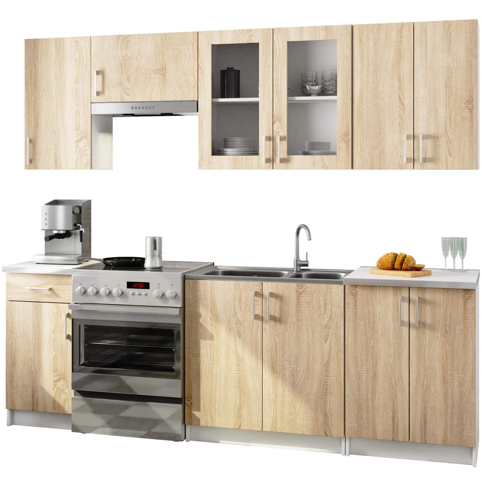 Zestaw mebli kuchennych z witryną LIMA w modnym kolorze dąb sonoma to propozycja stworzona z myślą o osobach, które poszukują prostych, ale funkcjonalnych mebli kuchennych. Jeżeli nie zależy Państwu na znalezieniu mebli pod wymiar, zachęcamy do skorzystania z przygotowanej przez nas oferty. Obejmuje ona szafki dolne oraz górne, które z pewnością sprostają Państwa oczekiwaniom pod względem praktycznego zastosowania oraz łatwości czyszczenia. Ich dodatkowym atutem jest uniwersalny, modny wygląd, który nada kuchni niepowtarzalnego charakteru. System szafek został również wyposażony w atrakcyjny wizualnie oraz pod względem praktycznym blat. Zestaw mebli kuchennych LIMA to propozycja dostępna w naszym sklepie internetowym w konkurencyjnej cenie. Kuchnia stanowi serce każdego domu, miejsce, w którym domownicy codziennie przygotowują posiłki dla całej rodziny i spędzają wiele czasu, dlatego warto urządzić to pomieszczenie z pomysłem, w sposób jak najbardziej funkcjonalny przy użyciu trwałych i solidnie wykonanych mebli.