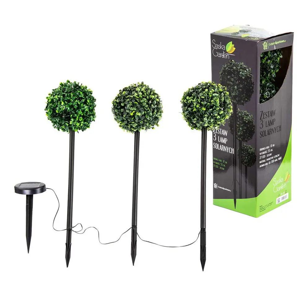 Solarne lampy ogrodowe cieszą się dużym zainteresowaniem i doskonałymi opiniami użytkowników. Nic dziwnego. To najlepsze i zdecydowanie najtańsze źródło energii elektrycznej. ZESTAW LAMP SOLARNYCH 3 KUL BUKSZPANOWYCH 27LED jest bardzo praktycznym rozwiązaniem. Po zmroku będzie nieco więcej światła, dzięki czemu nie potkniesz się, nie narazisz na upadek, a Twoi goście znajdą drogę do wyjścia. Elegancki wygląd ZESTAWU LAMP SOLARNYCH 3 KUL BUKSZPANOWYCH 27LED stworzy niepowtarzalny klimat na Twojej posesji lub w ogrodzie.