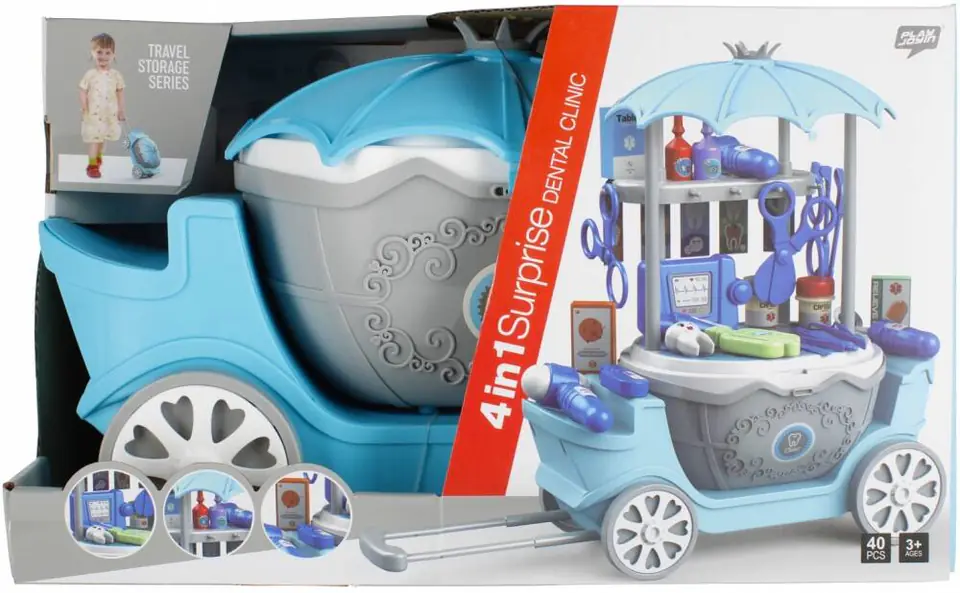 Akcesoria zamknięte są w walizce na kółkach, zestaw można również przenosić w koszyku, sznurki służą jako uchwyt. Występuje w kolorze niebiesko-popielatym.
