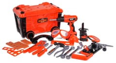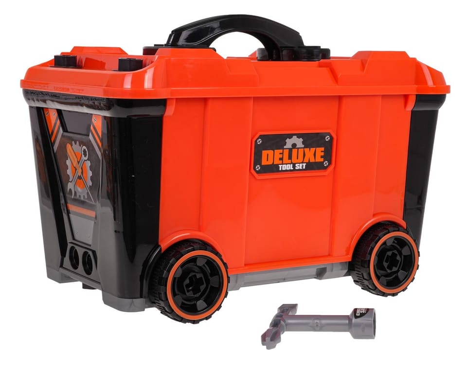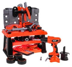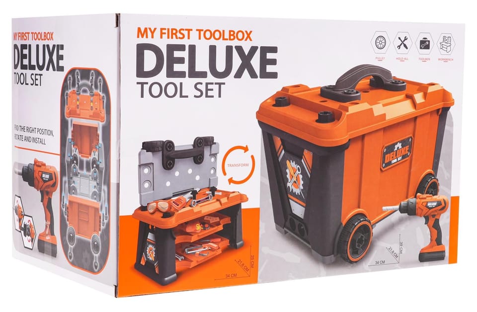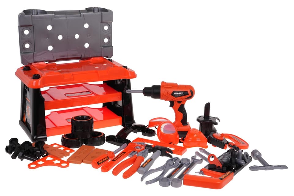 Bogato wyposażony zestaw narzędzi 2 w 1 dla małych majsterkowiczów od 3-go roku życia. Z zestawu możemy zbudować stolik warsztatowy a po skończonej zabawie przekształcić go w walizkę na narzędzia dołączone do zestawu. Zestaw zawiera 65 elementów takich jak części składowe warsztatu, narzędzia, piłę, śrubokręty, wiertarko-wkrętarkę na baterie, dużą ilość śrubek itp. Wkrętarka zasilana jest bateriami typu 2 x 1,5 V AA, brak baterii w zestawie. Wkrętarko-wiertarka działa jak prawdziwa, wkręca, wykręca, posiada też wyjmowany akumulator, 3 wymienne bity i końcówkę z piłą.