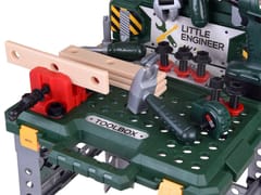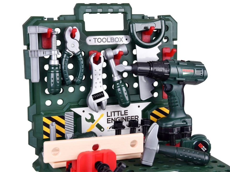 Nowy wielofunkcyjny warsztat dla małych mechaników. Pozwala dzieciom naśladować czynności jakie wykonują rodzice. Mały warsztat może stanąć jako stanowisko do pracy dla dziecka obok stanowiska jego taty. Dziecko poprzez zabawę może uczyć się majsterkowania od najmłodszych lat.