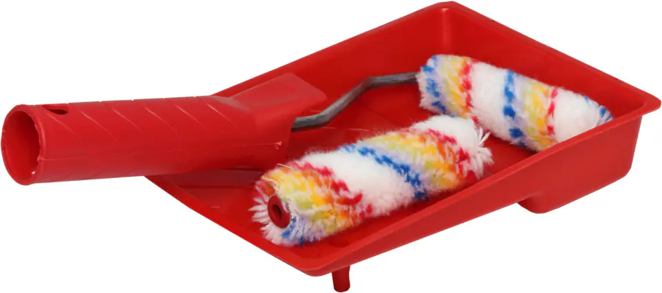 - W zestawie: krótka i lekka rękojeść z drutem stalowym Ø 6 mm, 2 wkłady o wym. 100 x 10 mm oraz kuweta malarska o wym. 140 x 190 mm