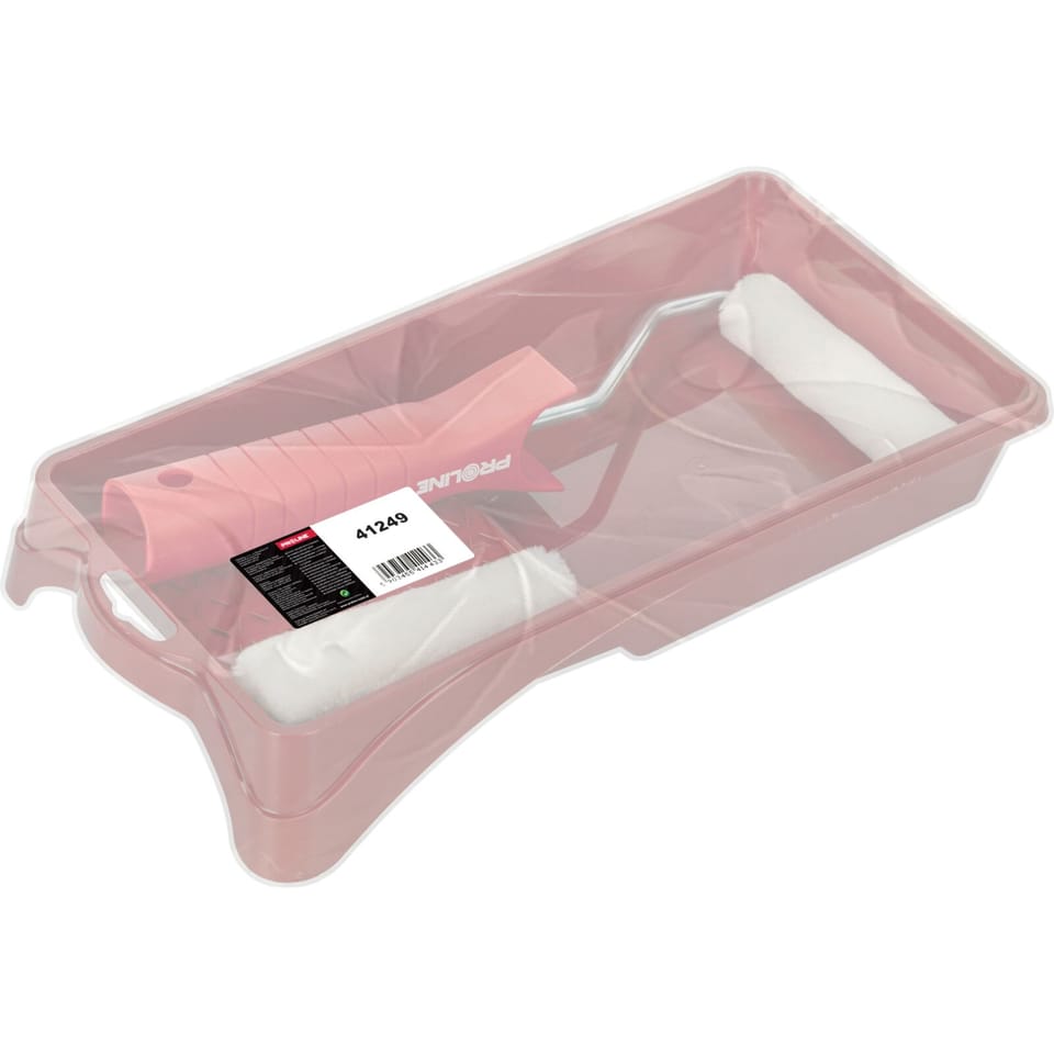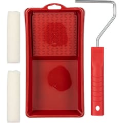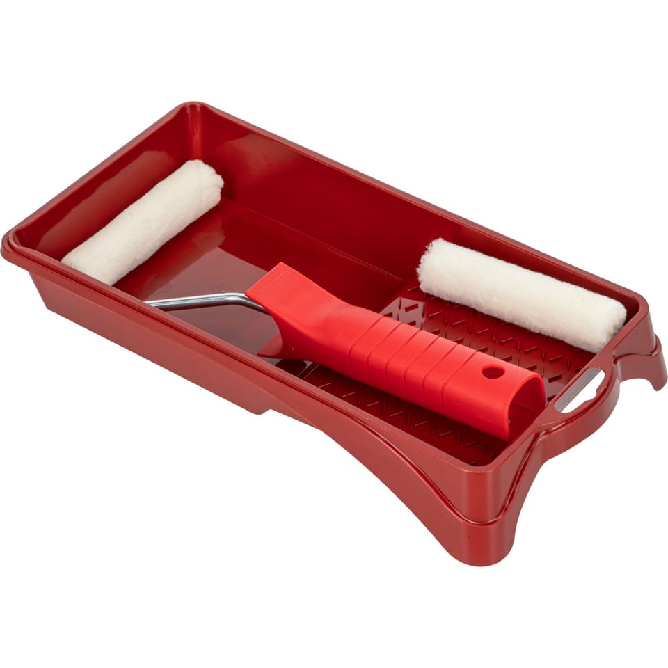- W zestawie: krótka i lekka rękojeść z drutem stalowym Ø 6 mm, 2 wkłady o wym. 100 x 10 mm oraz kuweta malarska o wym. 140 x 190 mm