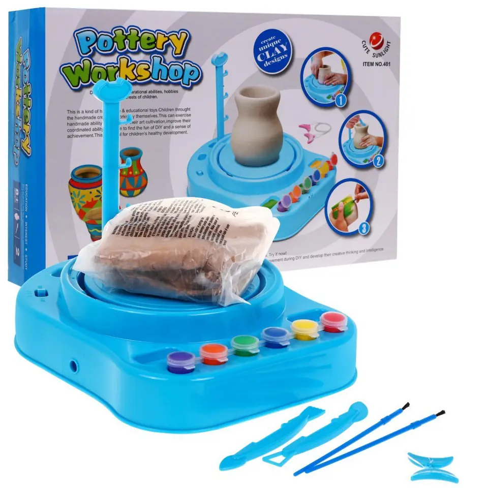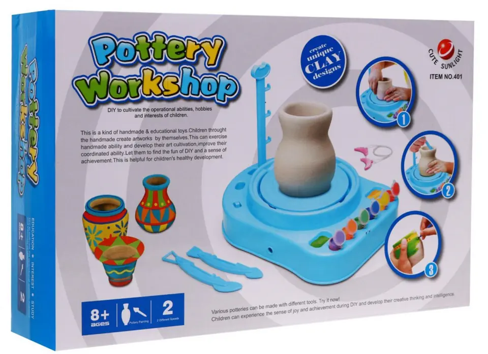 Zestaw małego garncarza to edukacyjna zabawka do samodzielnego robienia oraz malowania ceramicznych naczyń. Dziecko może zrobić swoje własne doniczki, kubeczki czy dzbaneczki a następnie je ozdobić farbkami według własnego pomysłu. Koło garncarskie obraca się w dwóch prędkościach, wolniejszej i szybszej. Zabawka pobudza wyobraźnię, rozwija umiejętności zręcznościowe, manualne i plastyczne. Zabawka przeznaczona jest dla dzieci od 8-go roku życia i posiada certyfikat CE. Zabawka zasilana jest bateriami typu 3 x R14 (brak w zestawie).