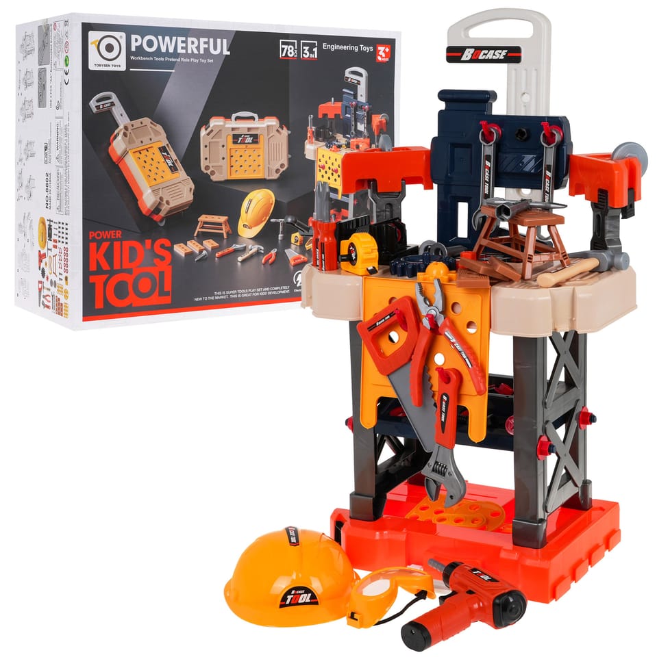| Bogato wyposażony zestaw narzędzi 3 w 1 dla małych majsterkowiczów od 3-go roku życia. Z zestawu możemy zbudować stolik warsztatowy a po skończonej zabawie przekształcić go w walizkę na narzędzia dołączone do zestawu. Możemy zbudować walizkę z rączką do przenoszenia lub walizkę na kółkach do pchania. Zestaw zawiera 78 elementów takich jak części składowe warsztatu, kask, piła, śrubokręty, wiertarko-wkrętarkę na baterie, dużą ilość śrubek itp. Wkrętarka zasilana jest bateriami typu 2 x 1,5V AA, brak baterii w zestawie. Wkrętarko-wiertarka działa jak prawdziwa, wkręca, wykręca, a podczas pracy świeci się czerwona dioda na przodzie zabawki. | |