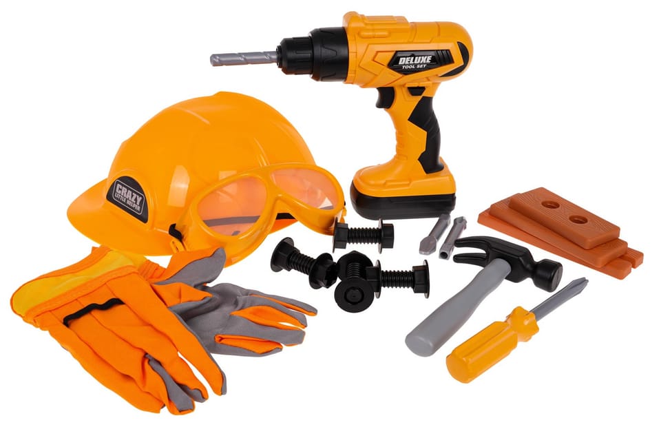 | - kask,- rękawiczki,- śrubokręt,- młotek,- okulary ochronne,- 3 x drewienka do wkręcania,- 4 x nakładka,- 4 x śrubka,- wiertarko-wiertarka,- wymienne bity: płaski i krzyżakowy, wiertło. |