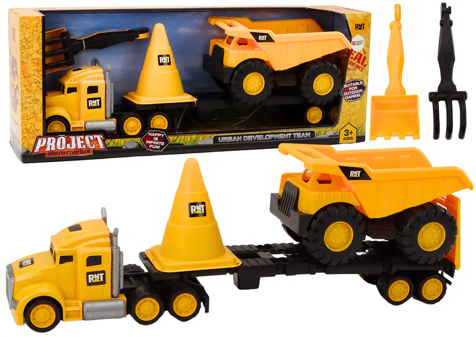 Zestaw zabawek budowlanych to prawdziwy skarb dla każdego małego konstruktora! W komplecie znajduje się żółta ciężarówka z lawetą, wywrotka, duży żółty pachołek oraz łyżka z grabiami które zapewnią godziny niekończącej się zabawy w domu jak i na zewnątrz.