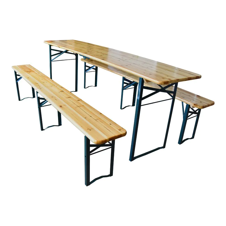 Zestaw ogrodowy dwóch ławek i stołu drewnianego to doskonałe rozwiązanie, które sprawdzi się w ogrodzie, kempingu czy na uroczystości. Zestaw można rozłożyć samemu w zaledwie kilka minut. Meble posiadają zabezpieczenia przed rozłożeniem się aby wszystko stało stabilnie i było bezpieczne. Ramy wykonane z wytrzymałej stali, które można złożyć w kilka minut a dzięki temu zestaw zajmuje mało miejsca i jest łatwy w transporcie. Siedziska oraz blat wykonane z wytrzymałego, solidnego drewna. Zestaw po rozłożeniu zajmuje aż 216cm długości a po złożeniu zaledwie 108cm. Komplet dopasowany tak aby mógł zostać złożony "w kanapkę" dzięki czemu zajmie mało miejsca a nawet kilka zestawów będzie bardzo łatwych w transporcie i przechowywaniu.