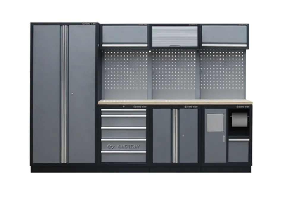 Zestaw mebli warsztatowych King Tony o wymiarach 2955 mm (dł.) x 460 mm (gł.) x 2000 mm (wys.) . W skład zestawu wchodzi 7 szafek metalowych w tym:- 2 szafki wiszące ścienne o wymiarach 680x350x280 mm z drzwiczkami otwieranymi do góry na teleskopach,- 1 szafki wiszące ścienne o wymiarach 680x350x280 mm zamykane roletą,- szafa dwudrzwiowa stojąca o wysokości 2000 mm z zamkiem,- 3 płyt ściennych perforowanych o wymiarach 615x1052x25 mm każda,- szafka podłogowa dwudrzwiowa z zamkiem i półką o wymiarach 680x910x460 mm,- szafka podłogowa z pięcioma szufladami na prowadnicach łożyskowanych z zamkiem centralnym 680x910x460 mm,- szafka podłogowa z miejscem na śmietnik, szufladą i uchwytem na ręcznik papierowy o wymiarach 680x910x460 mm.- blat roboczy laminowany Karta produktu - 87d11x03a-kg
