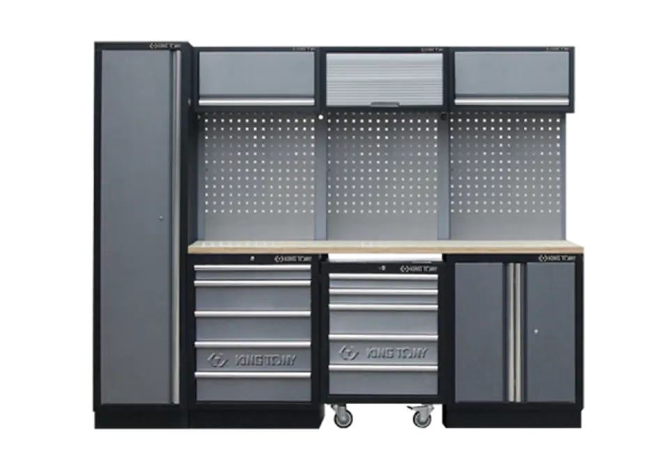 Zestaw mebli warsztatowych King Tony o wymiarach 2640 mm (dł.) x 460 mm (gł.) x 2000 mm (wys.) . W skład zestawu wchodzi 7 szafek metalowych w tym:- 2 szafki wiszące ścienne o wymiarach 680x350x280 mm z drzwiczkami otwieranymi do góry na teleskopach,- 1 szafki wiszące ścienne o wymiarach 680x350x280 mm zamykane roletą,- szafa jednodrzwiowa stojąca o wymiarach 600x2000x460 mm z zamkiem i półkami,- 3 płyt ściennych perforowanych o wymiarach 615x1052x25 mm każda,- szafka podłogowa dwudrzwiowa z zamkiem i półką o wymiarach 680x910x460 mm,- szafka podłogowa z pięcioma szufladami na prowadnicach łożyskowanych z zamkiem centralnym 680x910x460 mm,- szafka na kółkach z pięcioma szufladami na prowadnicach łożyskowanych z zamkiem centralnym,- blat roboczy laminowany Karta produktu - 87d11x04a-kg