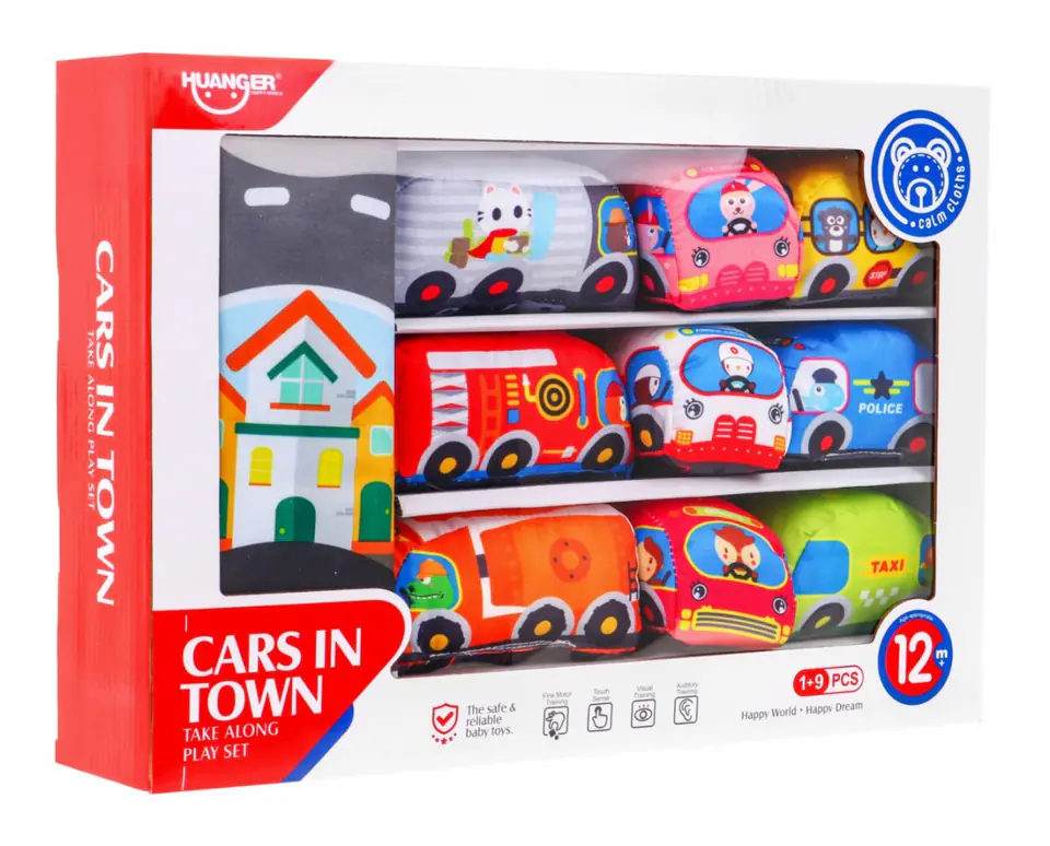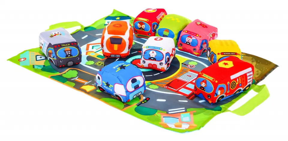 | - 9 bezpiecznych, miękkich w dotyku autek: * samochód ciężarowy, *pojazd z lodami, * autobus szkolny, * wóz strażacki, * ambulans, * taksówka, * betoniarka, *pojazd z donutami, *auto policyjne, - mata z ulicami i budynkami |