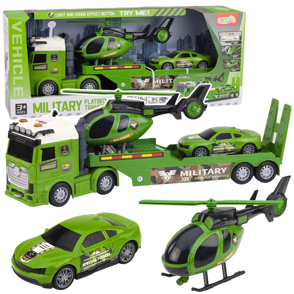 Centralnym elementem zestawu jest duża ciężarówka z lawetą przystosowaną do transportu pojazdów wojskowych. Na naczepie znajduje się miejsce na helikopter oraz samochód terenowy, dzięki czemu dziecko może odgrywać różnorodne scenariusze misji militarnych, transportu sprzętu oraz operacji specjalnych. Ciężarówka została wyposażona w efekty świetlne oraz dźwiękowe, które zwiększają realizm zabawy i sprawiają, że każda akcja wojskowa staje się jeszcze bardziej emocjonująca.
