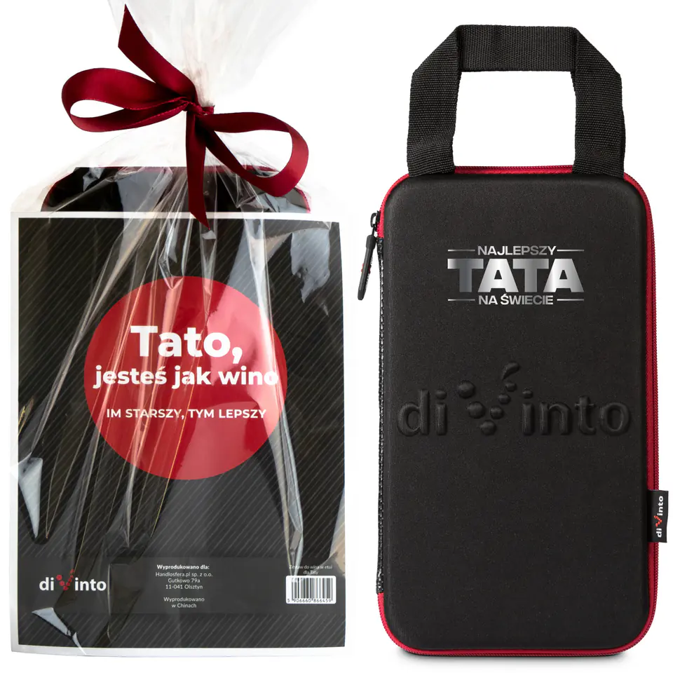 Chwile relaksu przy lampce wina Idealny prezent dla Taty, który ceni sobie chwile relaksu przy lampce wina. Dzięki eleganckiemu opakowaniu i praktycznym akcesoriom, Tata poczuje się doceniony i wyjątkowy. Zestaw zawiera wszystko, czego potrzeba, by delektować się ulubionym winem z klasą. To doskonały sposób na powiedzenie "Dziękuję" oraz okazanie, jak bardzo jest dla nas ważny. Idealny na urodziny, Dzień Ojca, czy każdą inną okazję, by sprawić Tacie radość i pokazać, że z wiekiem, jak dobre wino, staje się tylko lepszy. Wszystko, co potrzebne do właściwego podania wina W zestawie znajdziesz wszystko, co niezbędne do właściwego podania wina: elektryczny korkociąg, który w kilka sekund i bez wysiłku otwiera wino, wygodny nożyk do folii ochronnej, nalewak z aeratorem, który pomoże wydobyć z wina pełnię jego smaku, a także stoper z pompką próżniową, który przedłuży świeżość otwartego wina. Eleganckie czarne etui Całość jest zapakowana w eleganckie czarne etui, które ułatwia przenoszenie i przechowywanie zestawu, a do tego zrobi odpowiednie wrażenie na obdarowanej nim osobie.