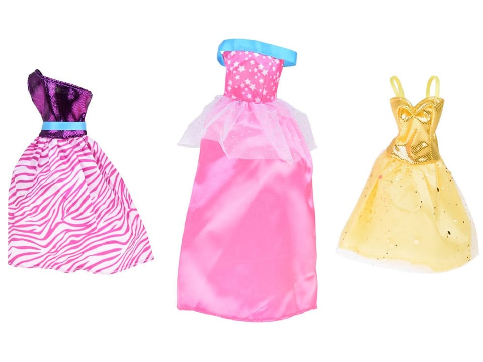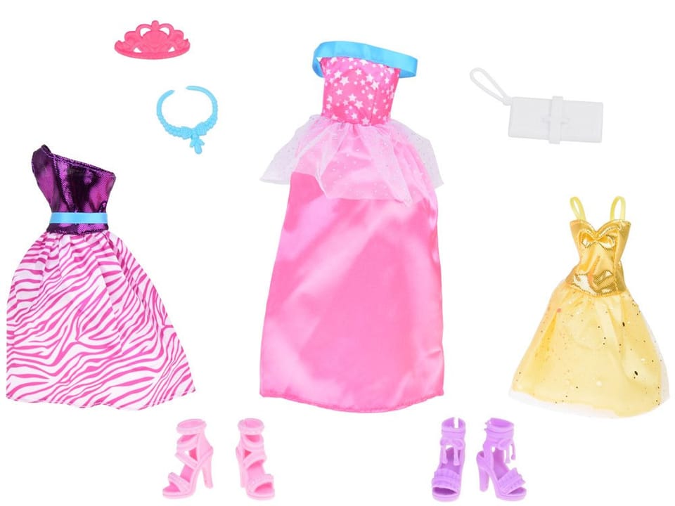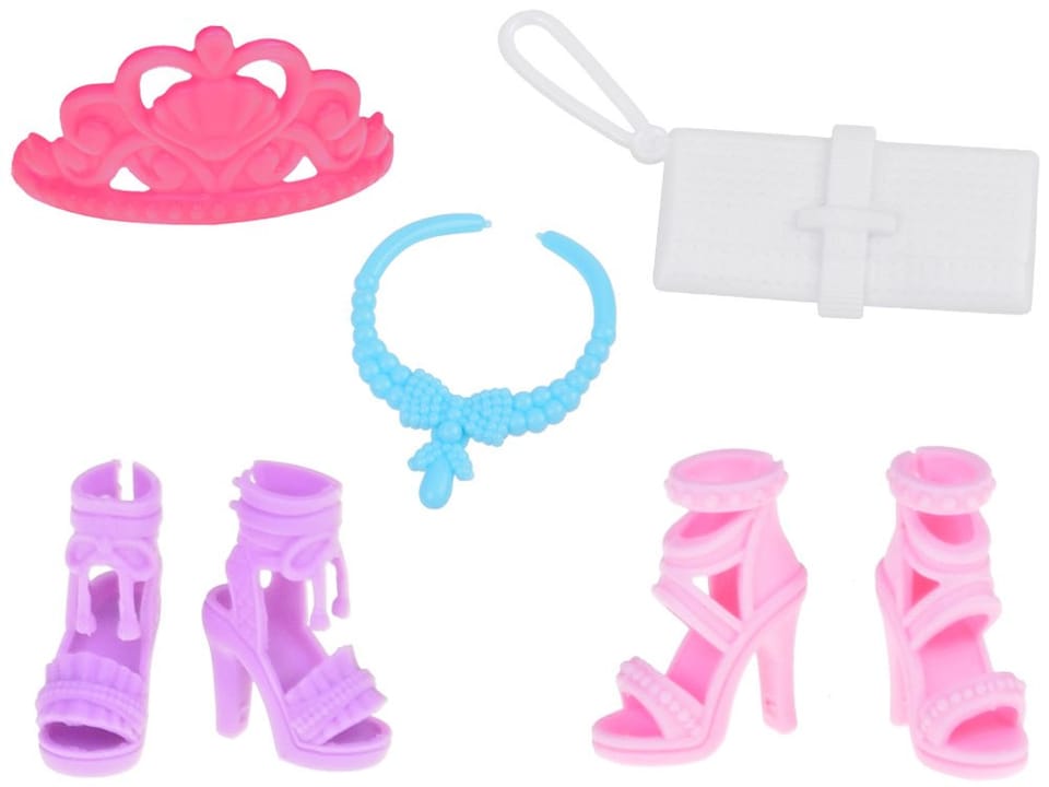 Zestaw zawiera:- 3 x różne sukienki- 2 x buty na obcasie- 1 x torebka- 1 x naszyjnik- 1 x korona
