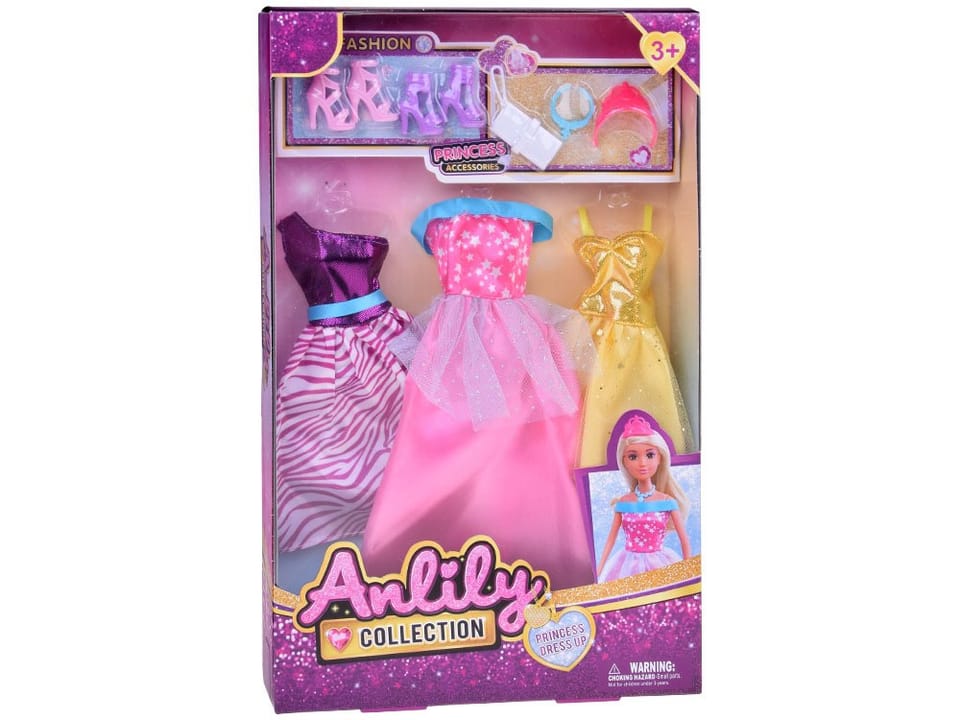 W komplecie znajdują się trzy różne sukienki - każda o unikalnym kroju i kolorystyce, dzięki czemu można tworzyć różnorodne stylizacje, dostosowane do każdej okazji. Dwie pary eleganckich butów na obcasie dodają szyku i klasy, a dopełnieniem całości są: efektowna torebka, niebieski naszyjnik oraz delikatna korona - idealna dla każdej małej księżniczki.