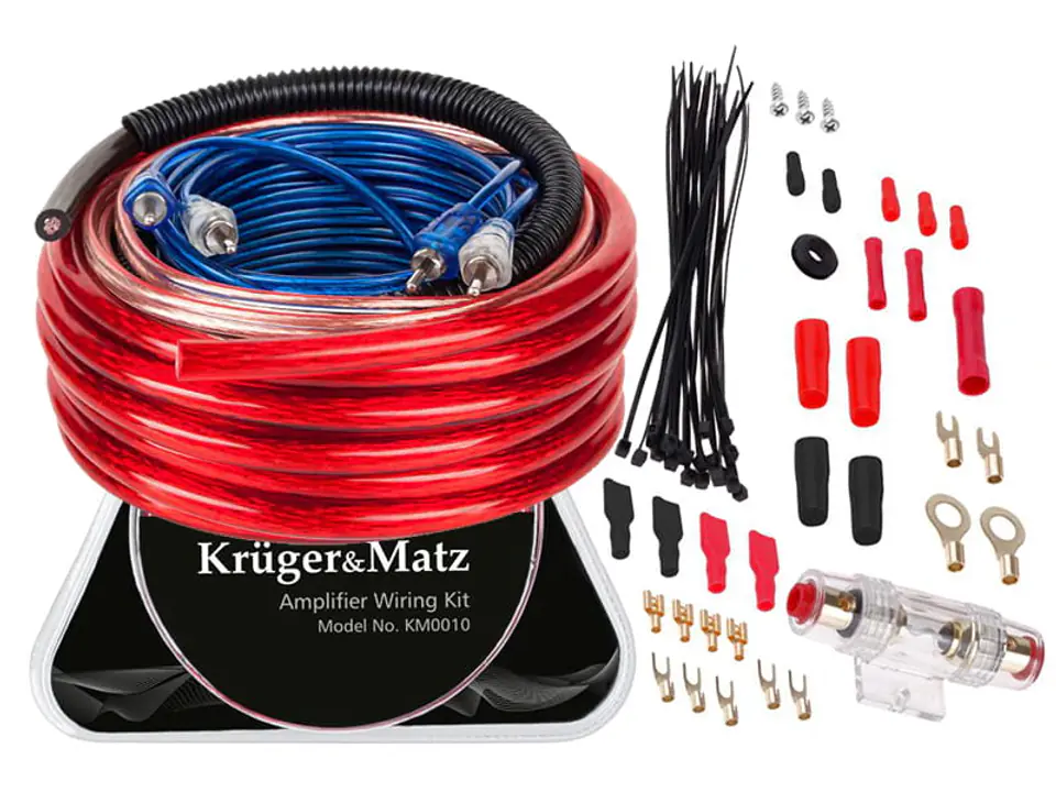 Podłączenie wzmacniacza samochodowego wymaga posiadania kilku dodatkowych akcesoriów, dlatego oprócz kilku przewodów - zasilania, głośnikowego, RCA i sterującego – w komplecie Kruger&Matz znalazły się także: gniazdo bezpiecznika z bezpiecznikiem 60 A oraz peszel, który zadba o bezpieczeństwo kabli, chroniąc je przed brudem czy wilgocią. W zestawie nie mogło także zabraknąć akcesoriów montażowych - wszystko po to, aby ułatwić Ci samodzielne podłączenie wzmacniacza. Rozbuduj swój samochodowy system audio i ruszaj w drogę.