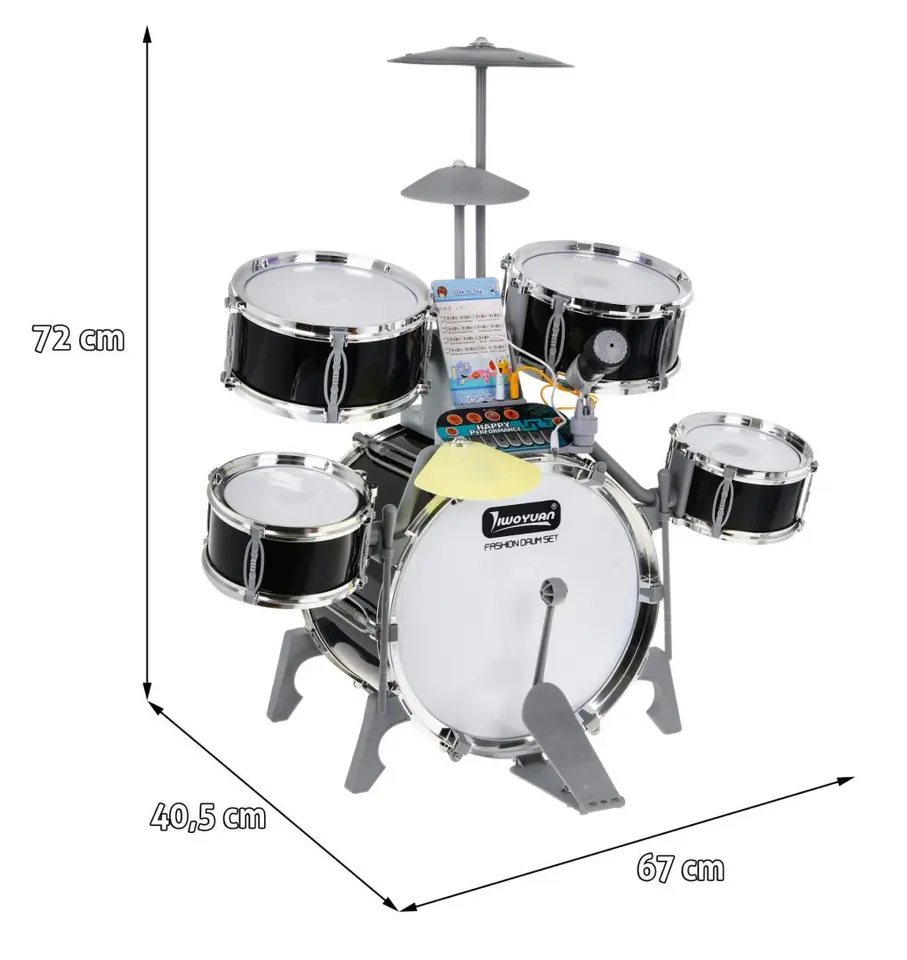 - perkusja ok. 72 cm x 67 cm x 40,5 cm, - bęben duży o średnicy 30 cm, - bęben średni o średnicy ok. 20 cm, - bęben mały o średnicy ok. 15 cm, - talerz metalowy o średnicy ok. 20 cm, - talerz elektryczny ok. 11,5 cm x 14 cm, - pałeczki ok. 23,5 cm, - stojak ok. 65 cm wysokości, - stołeczek ok. 22 cm x 19 cm, - opakowanie ok. 61 cm x 38 cm x 20,5 cm. |