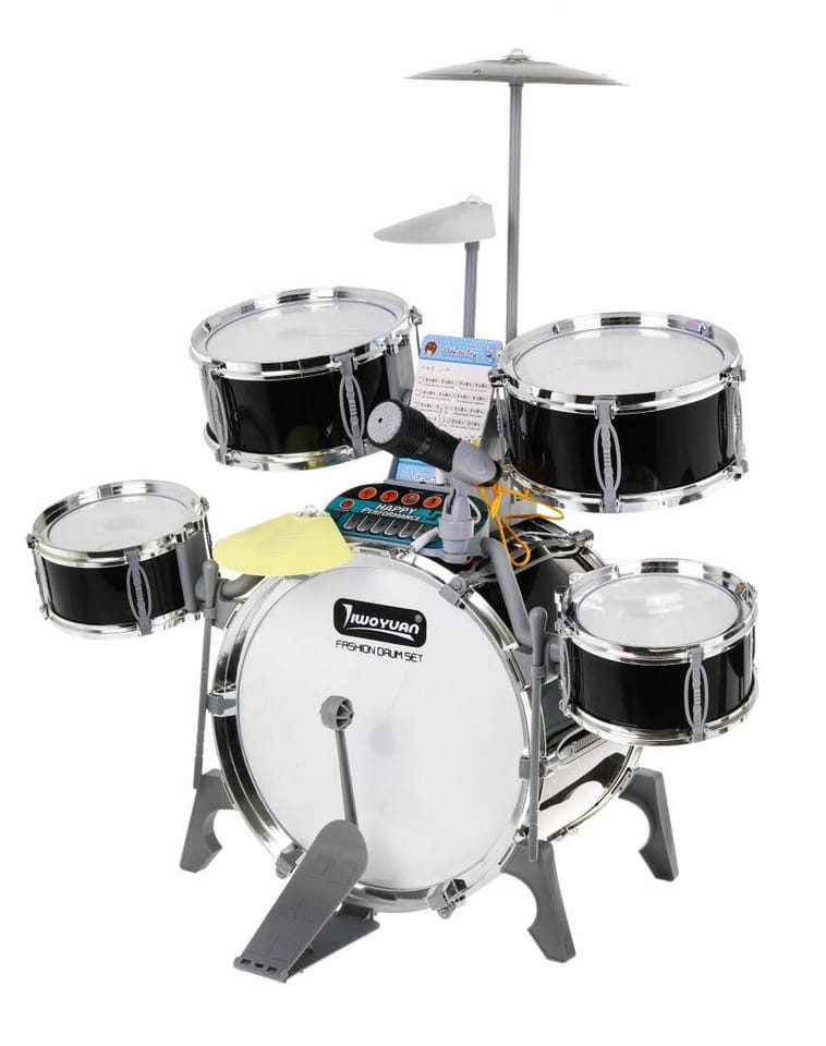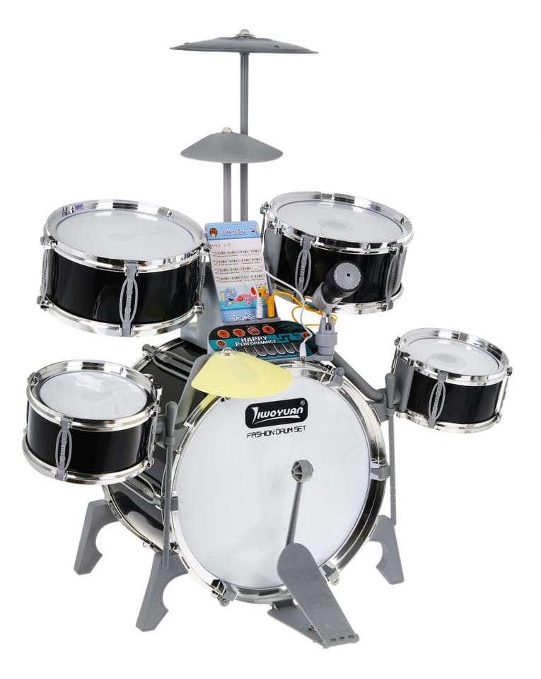 - bęben duży z pedałem do uderzania, - 2 x średni bęben, - 2 x mały bęben, - talerz metalowy, - 2 x talerz elektroniczny, - mikrofon, - 2 x pałeczka, - stołek, - kabel audio, - 6 kart z nutami, - obrazkowa instrukcja. | |