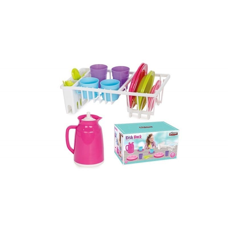 ZESTAW NACZYŃ Z SUSZARKĄ W zestawie: - suszarka do naczyń - 2 duże talarze - 2 małe talerzyki - 2 miseczki - dzbanek - 2 kubki - 2 szklanki - 2 zestawy sztućców Wymary: - Suszarki: 29 x 18 x 9 cm - Opakowania: 17,5 x 28,5 x 15,5 cm Wiek: 3+