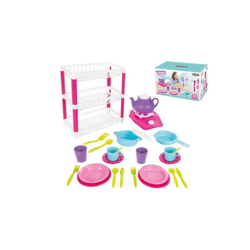 ZESTAW NACZYŃ Z SUSZARKĄ W zestawie: - suszarka do naczyń trzypoziomowa - kuchenka - czajnik - garnek - patelnia - pokrywka - 2 miseczki - 2 duże talerzyki - 2 małe talerzyki - 2 kubki - 2 szklanki - 2 zestawy sztućców - akcesoria kuchenne Wymary: - Suszarki: 30 x 31 x 19 cm - Opakowania: 30,5 x 18 x 19 cm Wiek: 3+