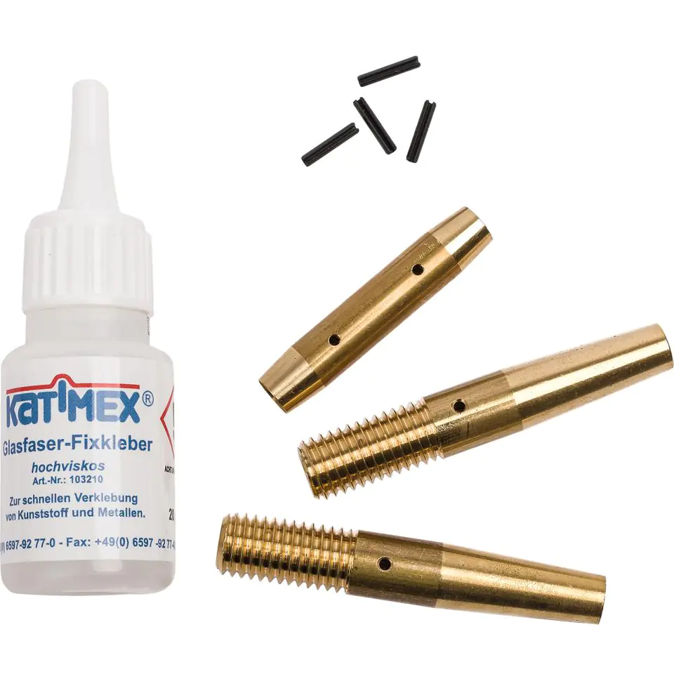 Zestaw naprawczy do taśmy złożony z 2 tulejek końcowych, tulejki łączącej, specjalnego kleju 3 g i 4 sworzni mocujących.