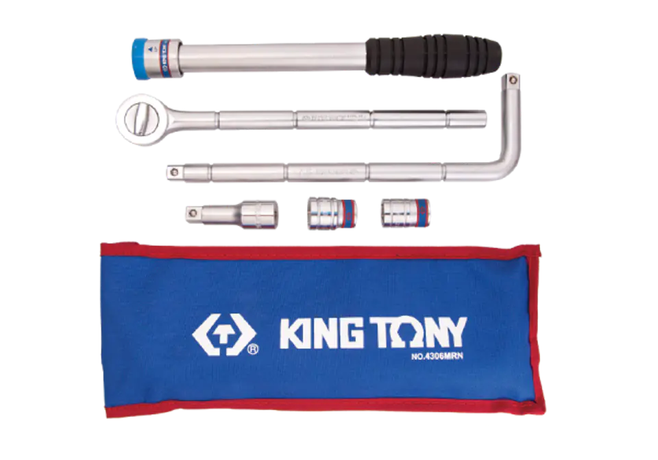 Zestaw kluczy do kół King Tony 4306MRN zawierający grzechotkę 1/2" oraz pokrętło L 1/2" z możliwością zastosowania dedykowanej przedłużki (w zestawie) z nasadkami 1/2" 6-kątów 17 i 19 mm oraz przedłużką 1/2" o długości 75 mm w materiałowym etui. Karta produktu - 4306MRN