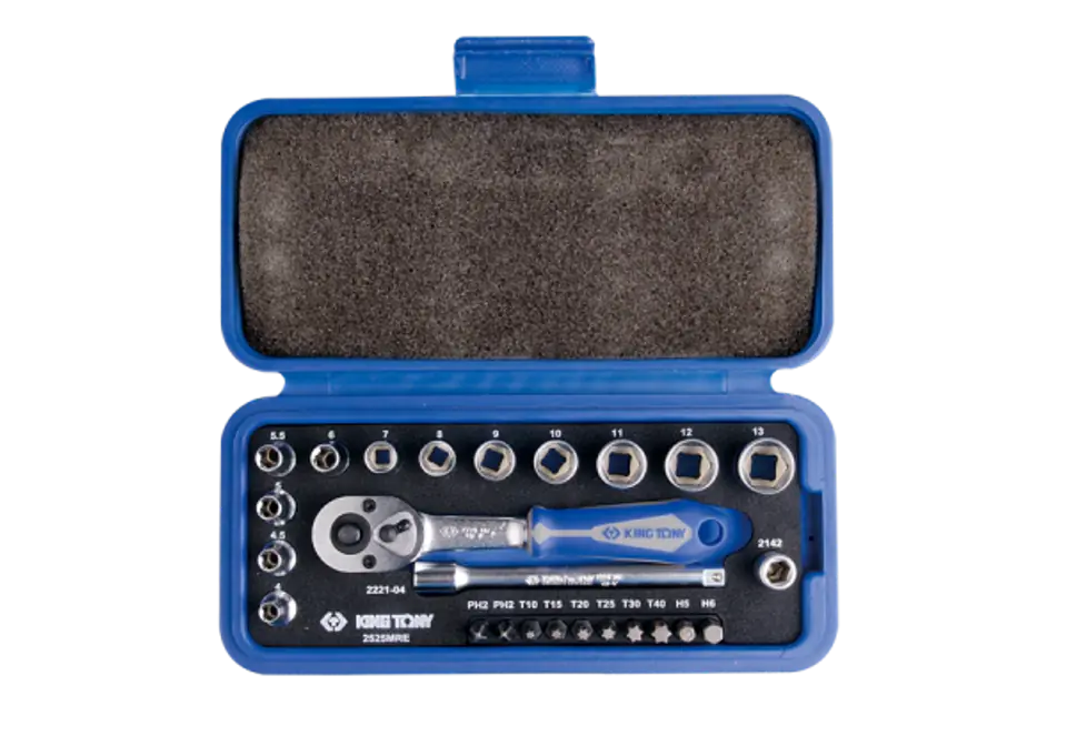 ZESTAW NARZĘDZI 1/4" 25cz. NASADKI KRÓTKIE, 6-kąt. 4 - 13mm Z GRZECHOTKĄ I AKCESORIAMI, KASETA King Tony