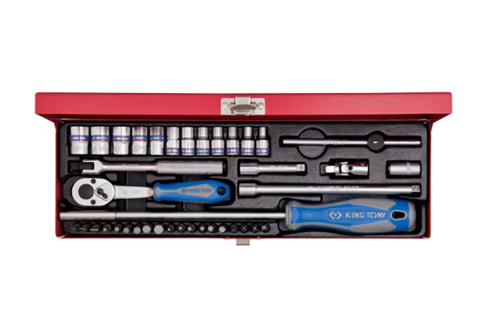 ZESTAW NARZĘDZI 1/4" 39cz. NASADKI KRÓTKIE, 6-kąt. 4 - 13mm + BITY, Z GRZECHOTKĄ I AKCESORIAMI, KASETA King Tony