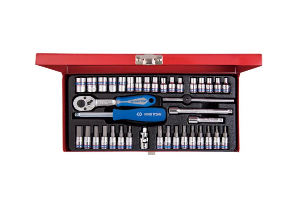 ZESTAW NARZĘDZI 1/4" 39cz. NASADKI KRÓTKIE, 6-kąt. 4 - 13mm, T8 -T40, HEX 3 - 10, E4 - E8 Z GRZECHOTKĄ I AKCESORIAMI, KASETA King Tony