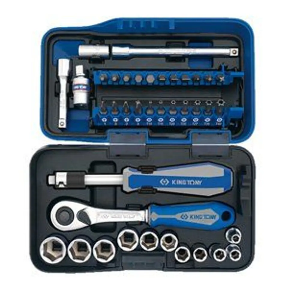 ZESTAW NARZĘDZI 1/4" 39cz. NASADKI KRÓTKIE, 6-kąt. 5 - 14mm + BITY, Z GRZECHOTKĄ I AKCESORIAMI King Tony