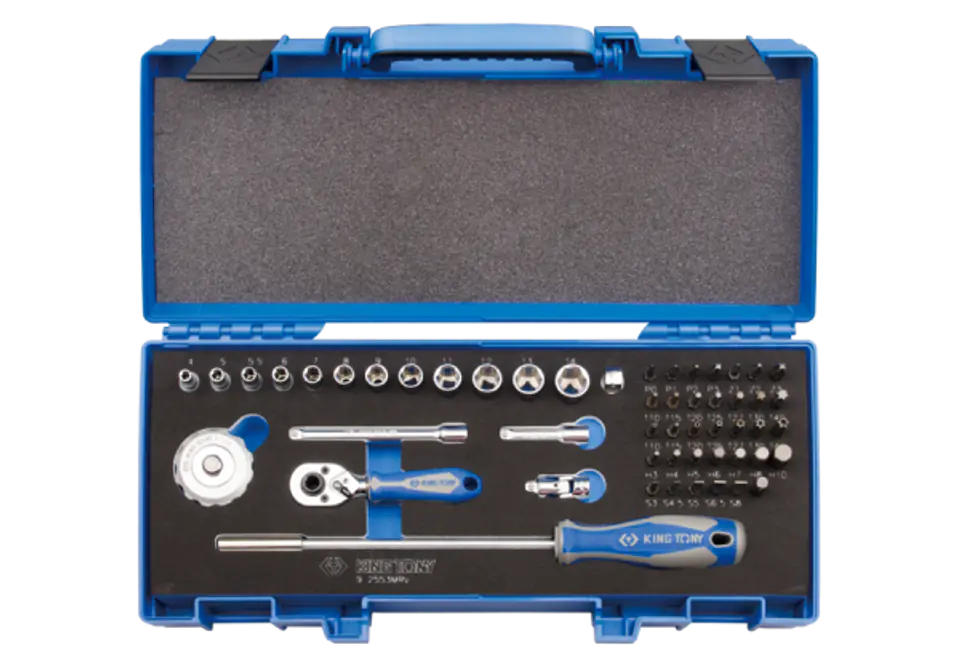ZESTAW NARZĘDZI 1/4" 53cz. NASADKI KRÓTKIE, 6-kąt. 4 - 14mm, HEX, TORX, PH, PZ, PŁASKIE, Z GRZECHOTKĄ I AKCESORIAMI, WALIZKA King Tony