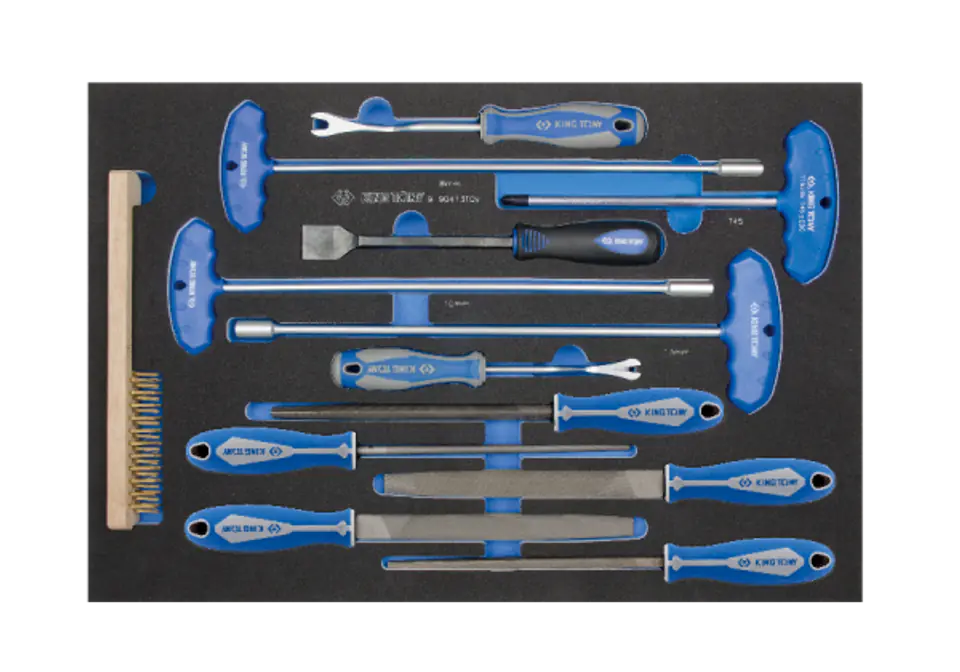 ZESTAW NARZĘDZI 13cz. SZCZOTKA DRUCIANA + KLUCZE NASADOWE + TORX T45 + PILNIKI + PRZYRZĄDY DO DEMONTAŻU TAPICERKI, WKŁAD Z PIANK King Tony