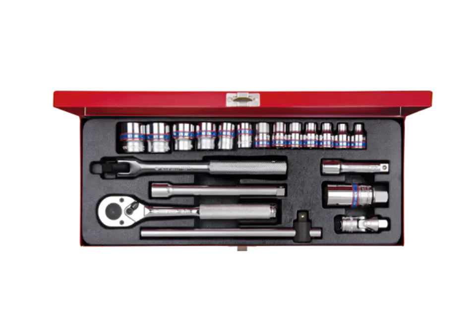 Zestaw narzędzi 3/8" King Tony w metalowej kasecie. W zestawie znajdują się:- 3330M nasadki krótkie 12-kątne w rozmiarach [ mm ]: 6, 7, 8, 9, 10, 11, 12, 13, 14, 17, 19, 21, 22, - 363021nasadka do świec 21 mm, - 3769-08F grzechotka z uchwytem moletowanym, - 3221-03, 3221-06 dwie przedłużki, - 3452-08F pokrętło łamane, - 3571-08 pokrętło przesuwne - 3792 przegub Kardana Karta produktu - 3020MR