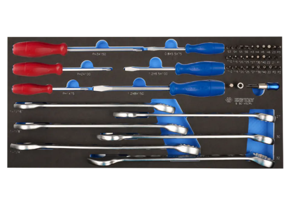 ZESTAW NARZĘDZI 45cz. KLUCZE PŁASKO-OCZKOWE CALOWE ,BITY 1/4", WKRĘTAKI, WKŁAD Z PIANKI EVA DO SKRZYNKI King Tony