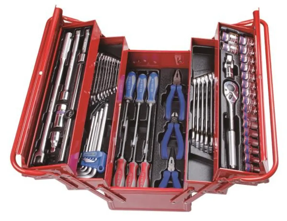 Zestaw 62 profesjonalnych narzędzi marki King Tony do skrzynki 87A05A. W skład zestawu narzędzi wchodzą: - zestaw kluczy płasko-oczkowych o wymiarach 6 - 22, 24 mm, - zestaw wkrętaków (PH1, PH2, PH3 i płaskie: 5,5, 6,5, 8), - zestaw szczypiec 3 szt., - zestaw narzędzi 1/2" (nasadki 10 - 32 mm (18 szt.), pokrętła, przedłużki, grzechotka), - zestaw imbusów z kulka H1,5 - H10. BEZ SKRZYNKI