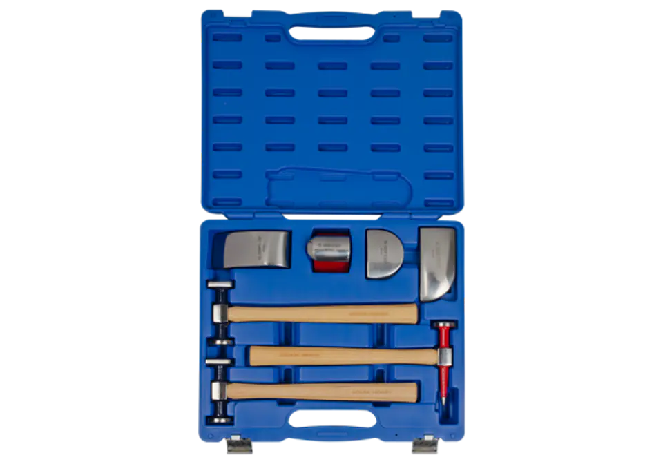 Zestaw narzędzi blacharskich 7 cz. w walizce plastikowej. W zestawie:- 9CF240 Kowadełko 28,5x29,1x121 mm - 9CF210 Kowadełko 69x64x42,3 mm - 9CF220 Kowadełko 58,6x45x133 mm - 9CF230 Kowadełko 60x30x79,3 mm - 9CF110 Młotek blacharski dł. całkowita 325 mm, dł.trzonka 98,5, waga 440g- 9CF120 Młotek blacharski dł. całkowita 325 mm, dł.trzonka 98, waga 467g- 9CF130 Młotek blacharski dł. całkowita 325 mm, dł.trzonka 138, waga 467g Karta produktu - 9CF-107